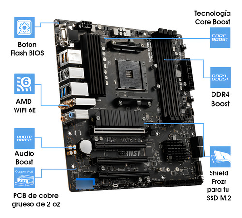 La MSI B550M PRO-VDH WiFi está diseñada para ofrecer una experiencia eficiente y duradera. Con soporte para PCIe 4.0 y un sistema de refrigeración optimizado, es la base perfecta para procesadores Ryzen que exigen estabilidad tanto en juego como en creación de contenido.
